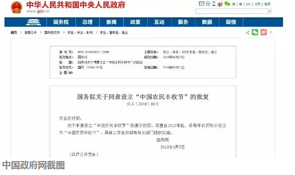 6月21日,国务院发布《关于同意设立“中国农民丰收节”的批复》,同意自2018年起,将每年农历秋分设立为“中国农民丰收节”。具体工作由农业农村部商有关部门组织实施。